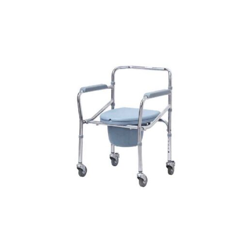 Ergonomic height adjustable design. Fixed gray plastic armrest. Durable stainless-steel frame. Removable oval commode bin with lid. Shock absorbing, durable 3” PVC wheels. 55cm/21.6in Commode with Wheels. 100kg/220lbs weight capacity. Weight: 8kg/17.6lbs.