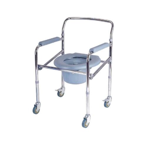 Commode wheelchair is a portable toilet chair that can be placed at the bedside of a patient whose activity is limited. Ergonomic height adjustable design. Fixed gray PVC armrest. Durable steel frame. Circular PVC seat. Shock absorbing, durable 3” PVC wheels.